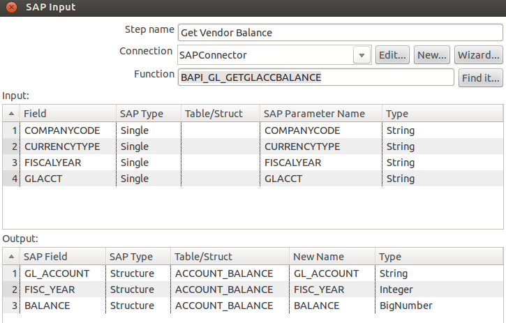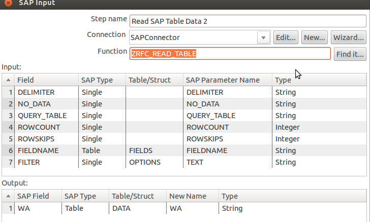 This SAP Input step in Pentaho+ Data Integration calls functions on SAP systems and can load tables via the function RFC_READ_TABLE or customized functions like BAPI.