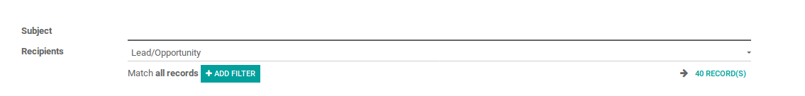 The subject of the mail can be entered. The recipients can be chosen from the options like, Contact,Lead/Opportunity etc., and the related records will be added automatically. If the Lead/Opportunity is selected, the related records or leads email ids will be added.