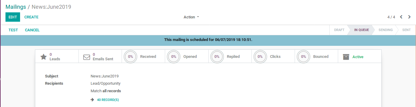 This allows us to create mailings with different templates that are already present in the module. The leads, customers and other groups from the Organization’s contacts can be grouped, and the respective newsletters can be sent to them using the Mailing Lists.