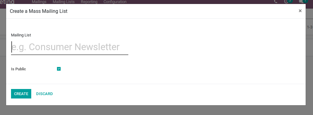 A new mailing list can be created by entering the name of the list and can be set public if needed.