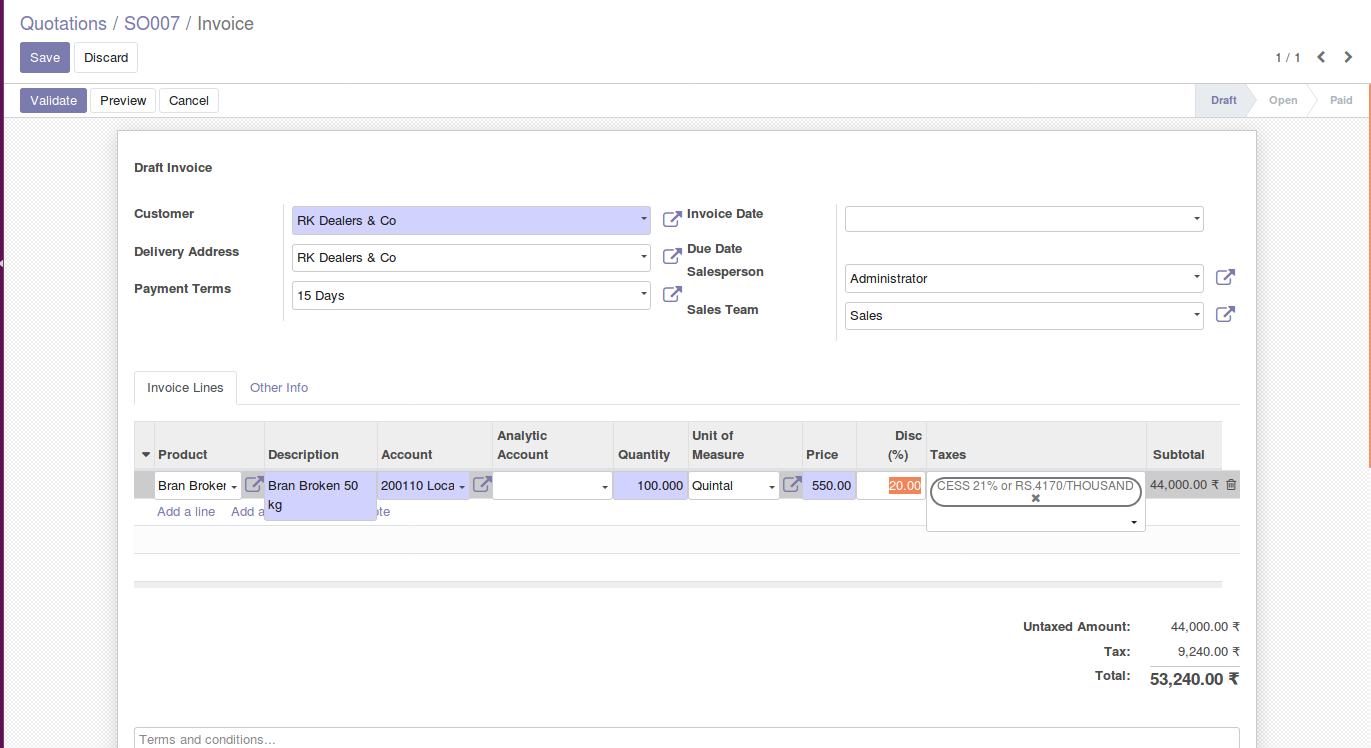 As an initial step, the quotation is sent to the customer quoting an amount for the products asked by the customer. The delivery address and their invoice address and mentioned separately. The template of the quotation can be set according to every customer or product.