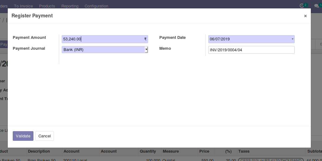 The invoice is validated, and the payment made by the customer has to be registered. The invoice can again be printed and sent to the customer.