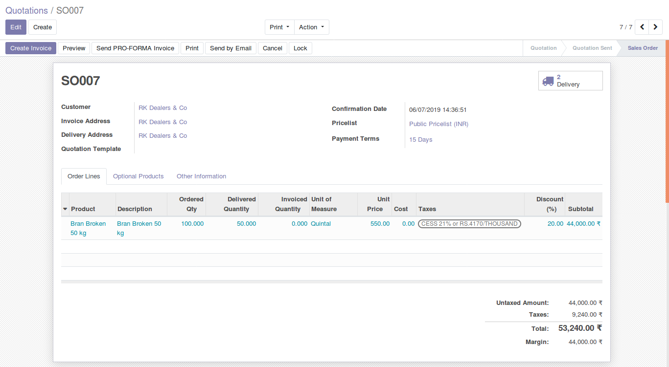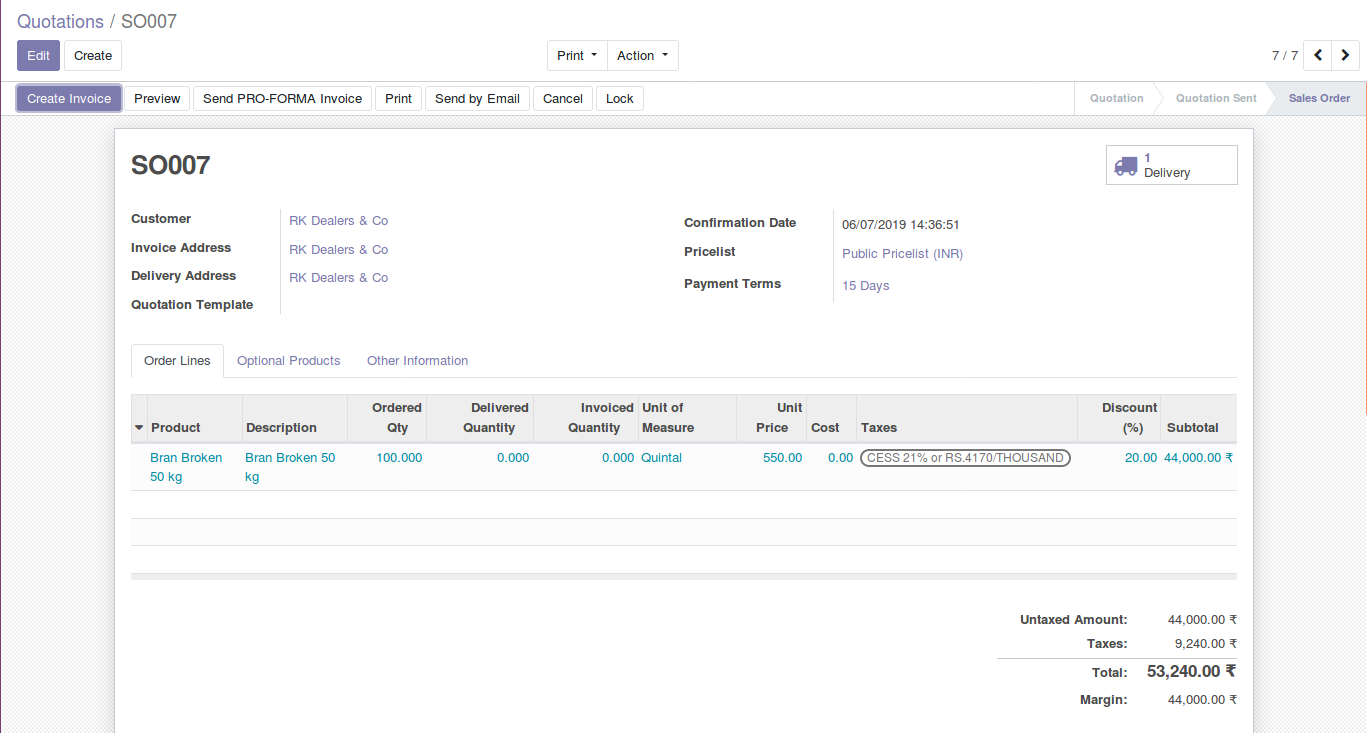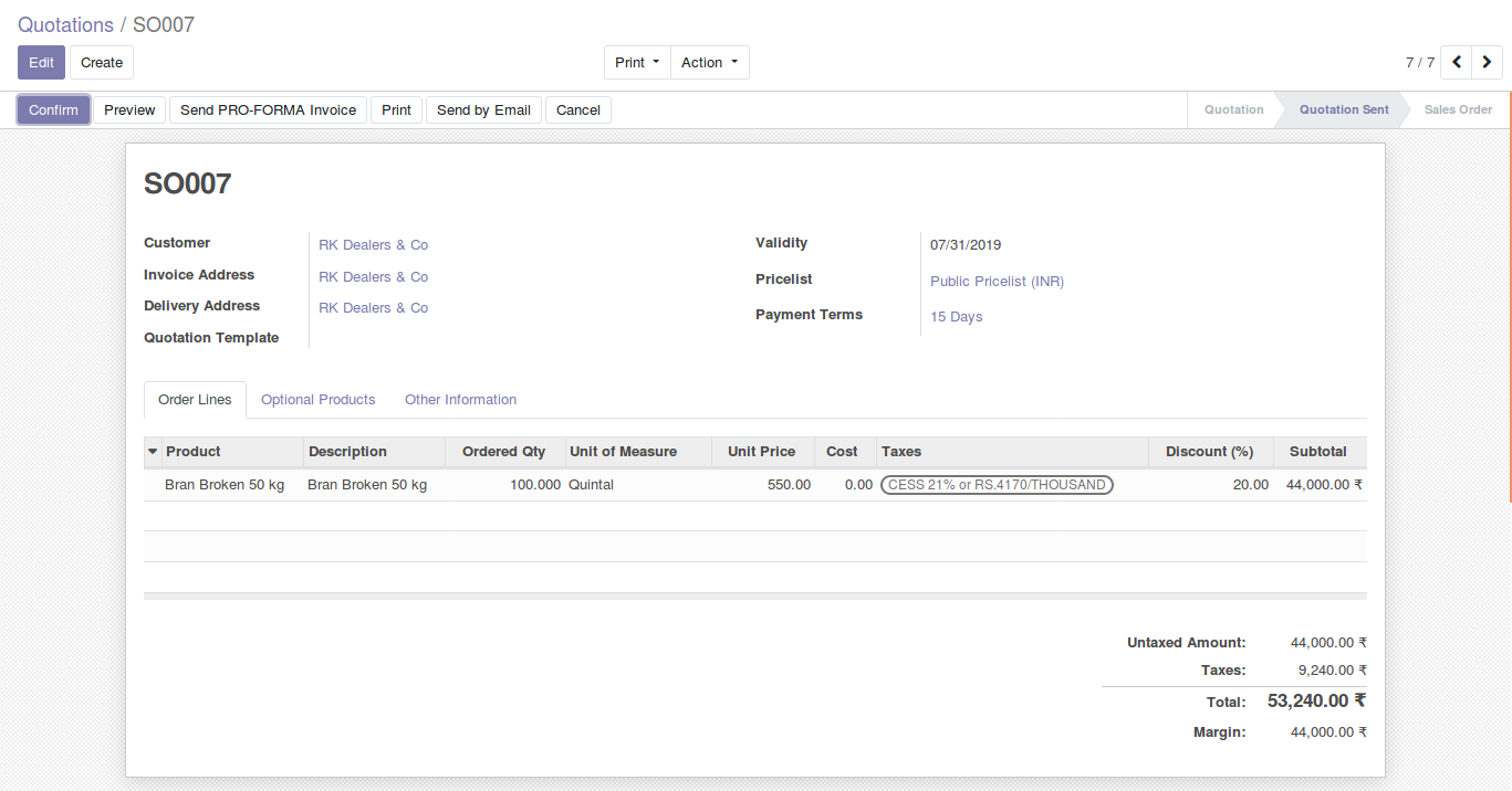 Once the details are entered correctly, the quotation can now be moved to the Sales order after clicking the Confirm button.