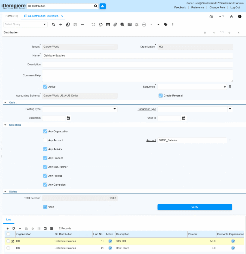 GL Distribution is an accounting allocation mechanism in iDempiere that automatically splits a single accounting posting into multiple postings based on predefined rules and percentages.