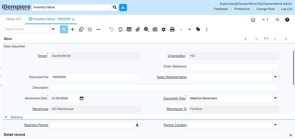 The Inventory Move window in iDempiere records the transfer of stock between different warehouses or locators within the same organization. Instead of affecting quantities through receipts or shipments, this document moves existing inventory internally from one place to another.