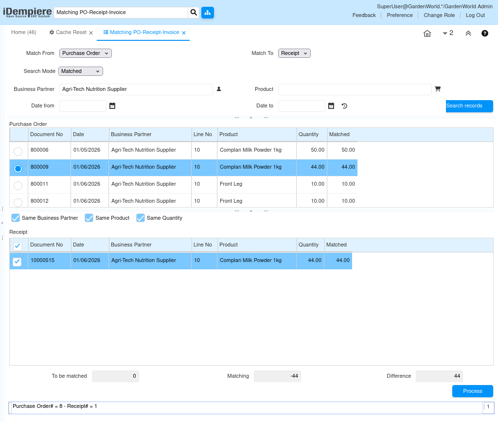 The dedicated matching form consolidates and displays PO data, receipt data, and invoice data side-by-side. iDempiere performs automated verification of quantity consistency and price alignment across all three documents.