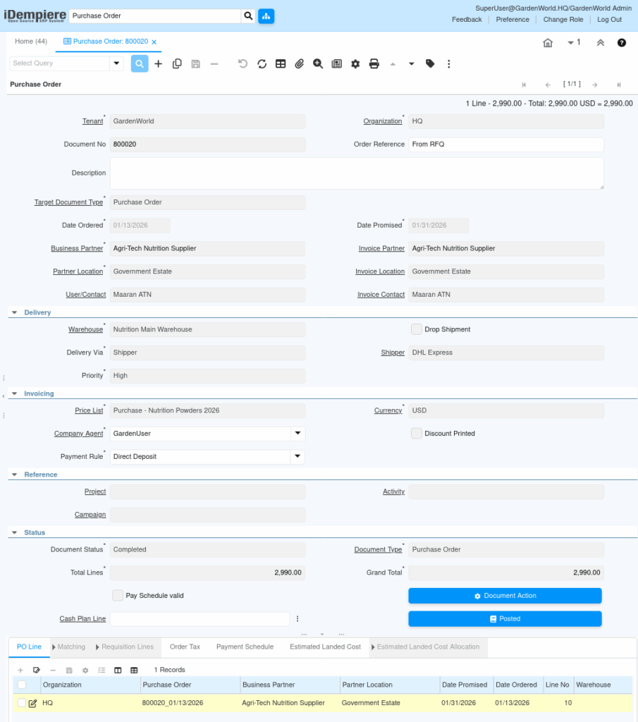 The purchase order created from an RFQ becomes the single operational contract that bridges strategic sourcing with day-to-day procurement execution in iDempiere.
