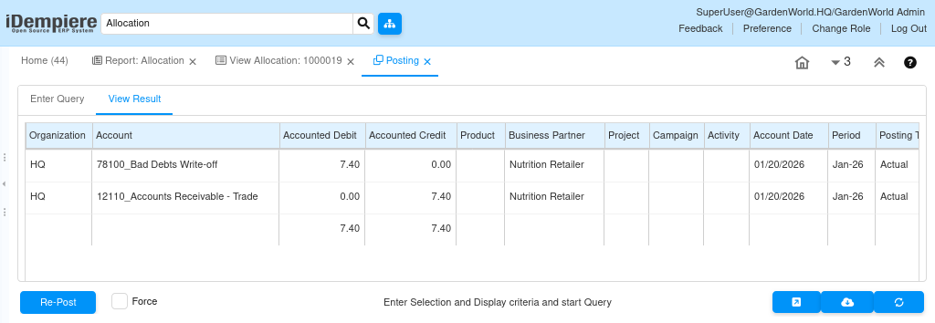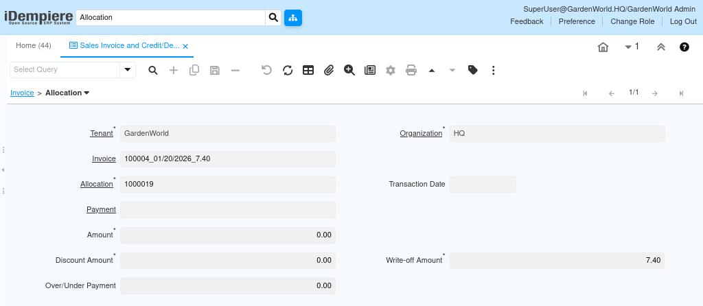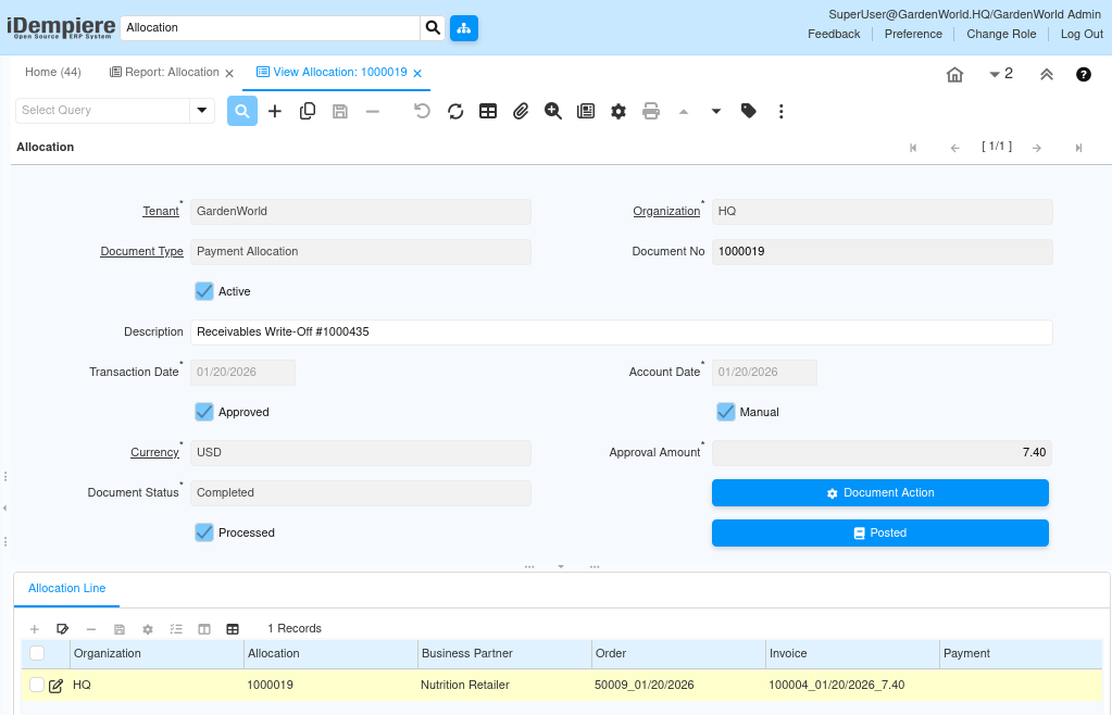 Instead of creating a real payment, iDempiere generates a manual payment allocation document. This allocation acts as the financial bridge that closes the invoice.