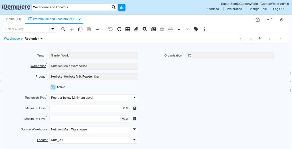 When the available quantity falls below the Minimum Level, iDempiere marks the product as needing replenishment.