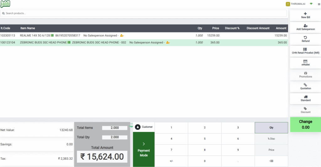 - Barcode scanning for quick product selection.