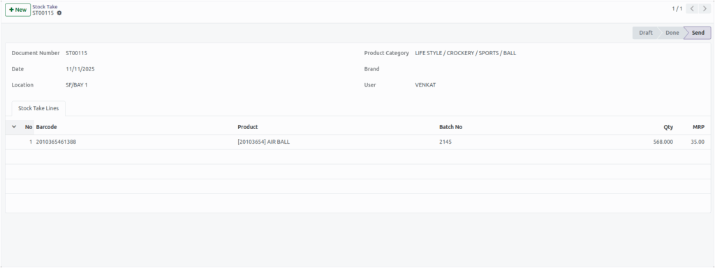 After a stock take document is created, the system automatically loads key product details into each stock line.This ensures consistency and speeds up data entry by eliminating the need for manual lookup.