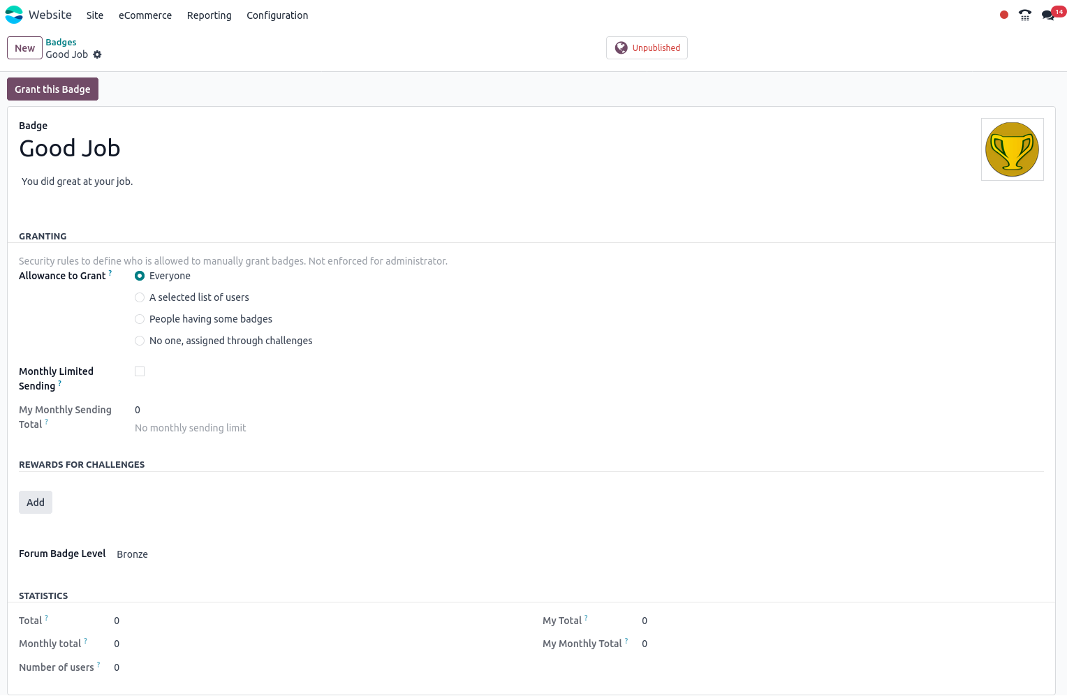In Odoo, Badges are part of the Gamification & Forum system. They act as rewards or recognition for users who contribute to the community or achieve specific milestones. Badges increase engagement, encourage quality participation and help identify knowledgeable members in the forum.Badges are displayed on user profiles and posts.