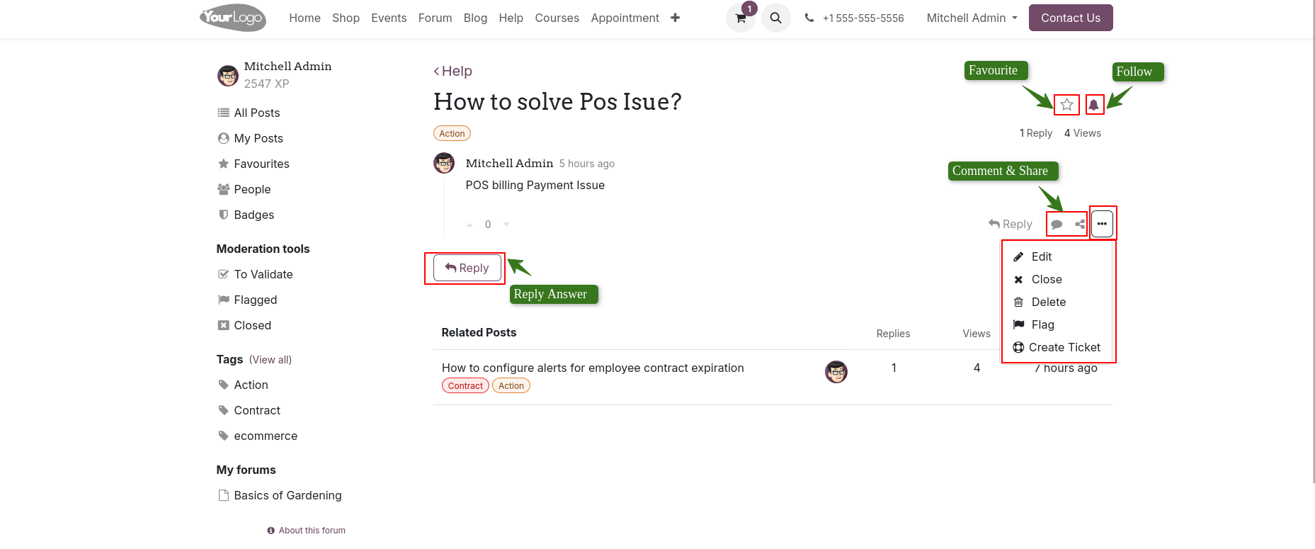 The Forum module in Odoo offers a rich set of Posted Questions that enhance user engagement and community collaboration. These tools allow users to express interest in topics, stay updated on relevant discussions, rate the usefulness of content and participate in conversations. Interaction buttons like Favorite, Follow, Vote, Mark Best Answer, Comment and Share are accessible directly on each post or answer, enabling seamless participation and moderation. These features help surface valuable content, encourage active participation and build a self-sustaining community of contributors.