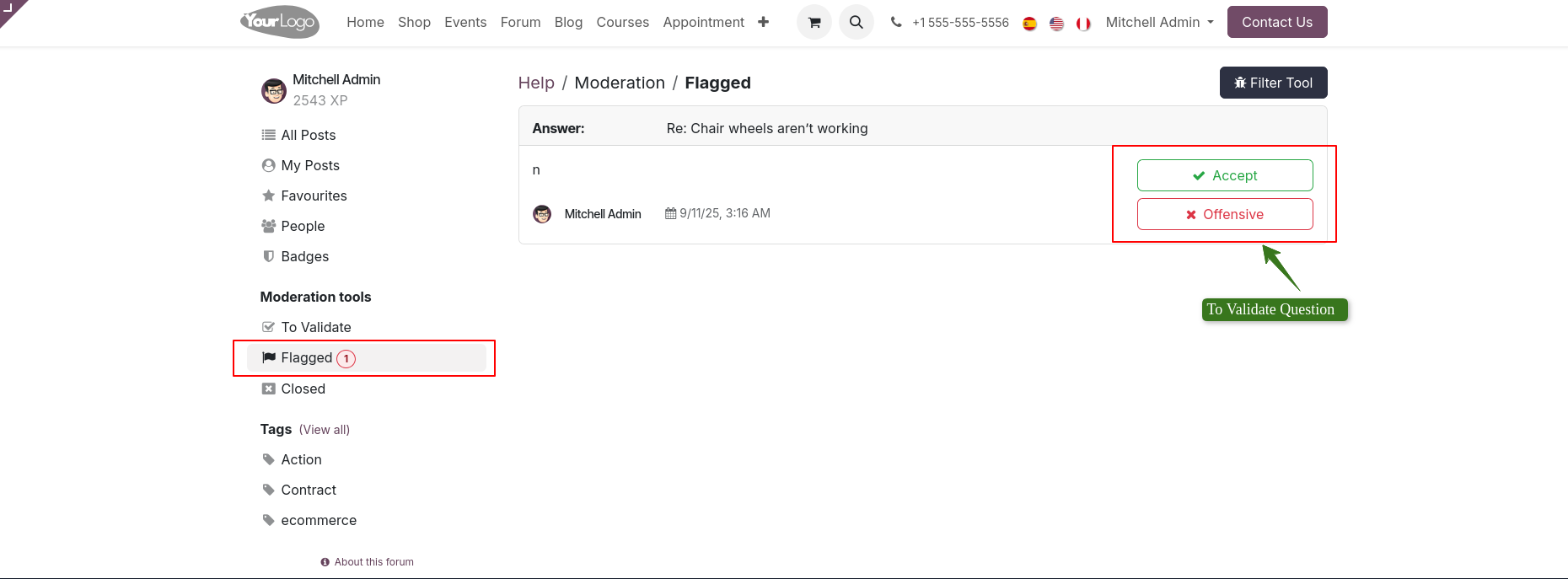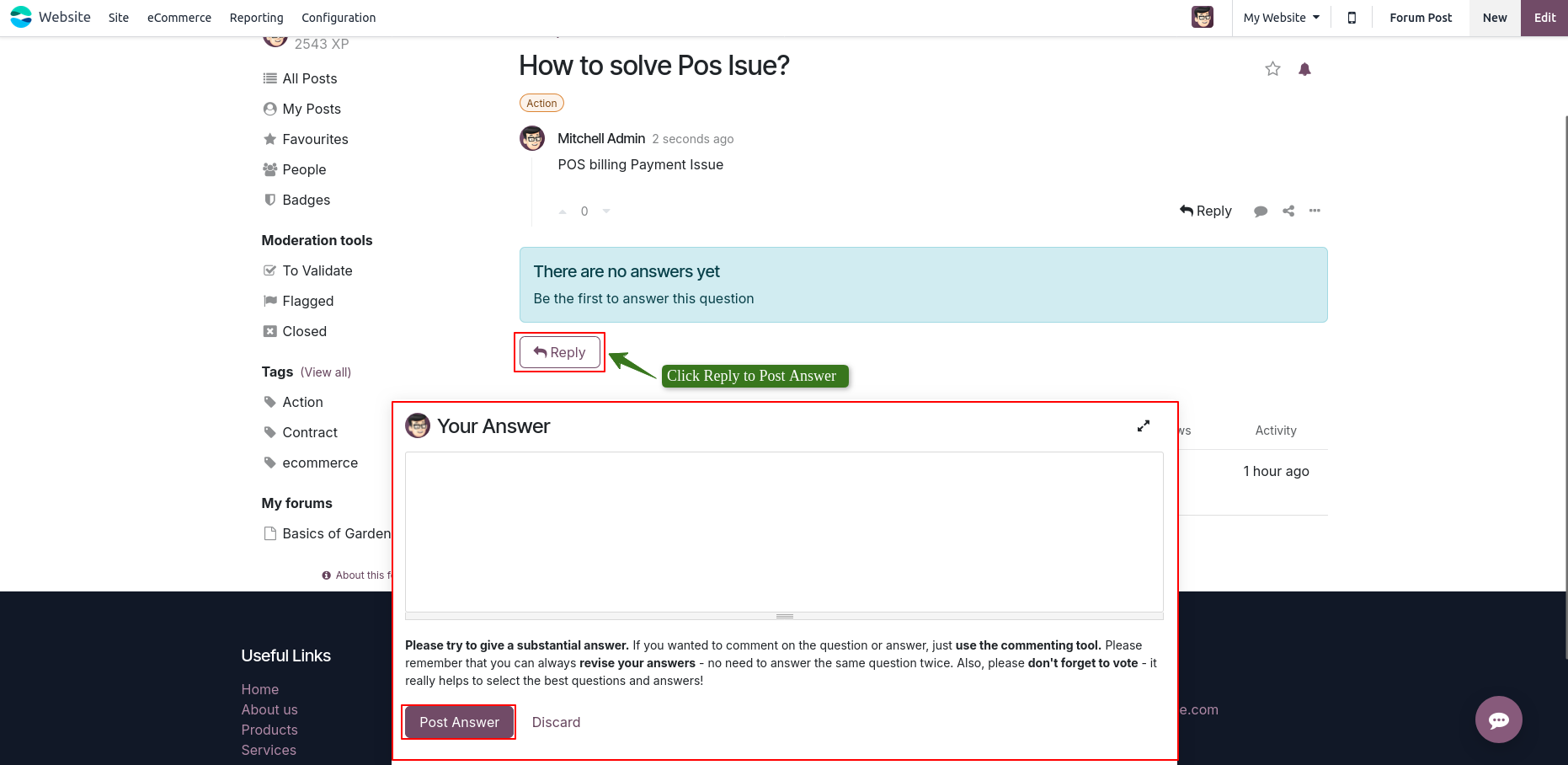 In Odoo Forum, answers posted by users with low karma may require validation by moderators before being publicly visible. This ensures quality control and prevents spam or inappropriate content. Moderators review and approve answers from the moderation panel on the forum’s front end.
