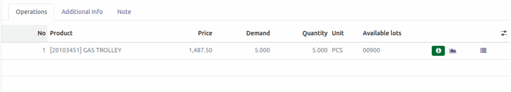 After clicking Mark as To-Do to proceed to the next screen, the Price, Quantity, and Available Lots fields will be displayed. Select the appropriate lot for the product being returned in the Available Lot field. For serial number products, in the Detailed Operations, select the serial number. The Quantity field is automatically filled based on the value entered in the Demand field.