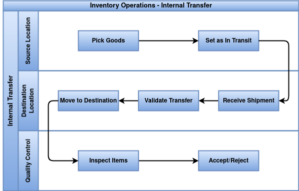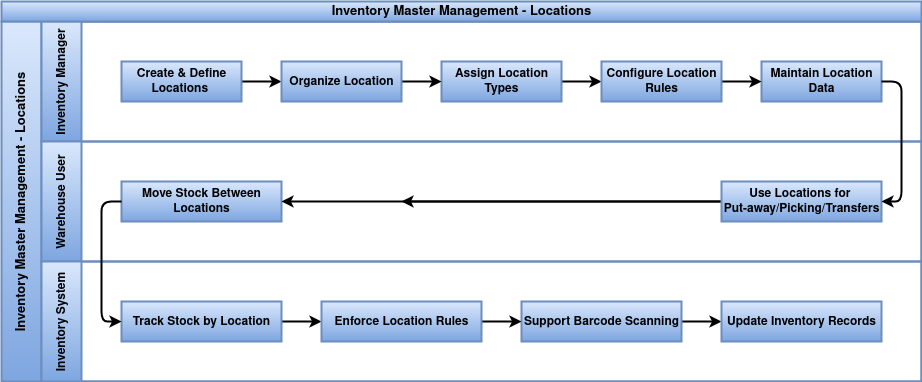 - Locations must have a defined type (internal, vendor, customer, production, inventory loss, or view).