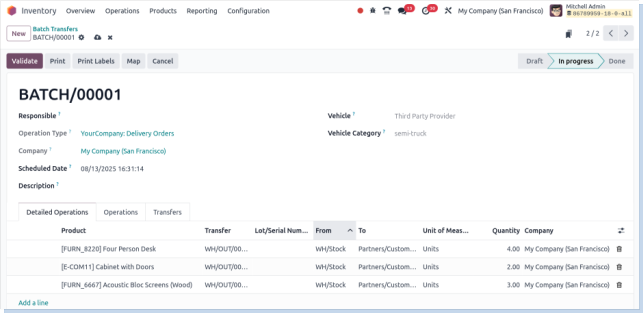 - Barcode scanning (if enabled) must verify each line item during batch picking or transfer.