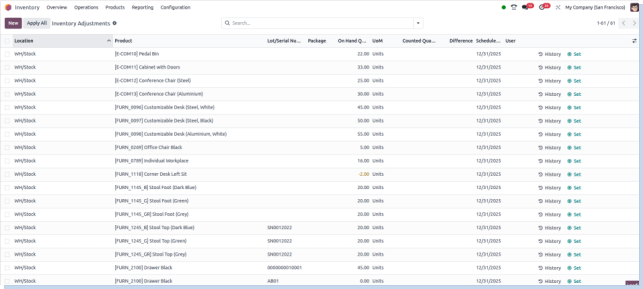 Odoo Inventory Reporting provides a comprehensive suite of reports to monitor and manage stock levels, product movements, warehouse operations, and inventory valuation. These reports support decision-making across warehouse, logistics, and accounting functions through real-time, filterable, and analytical data.
