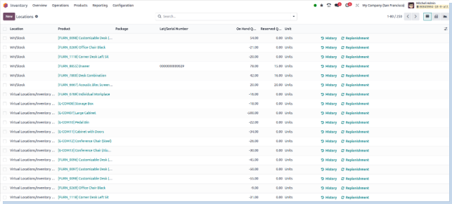 Displays product stock levels across all warehouses and locations in real time, helping users monitor inventory availability, shortages, and movement status.
