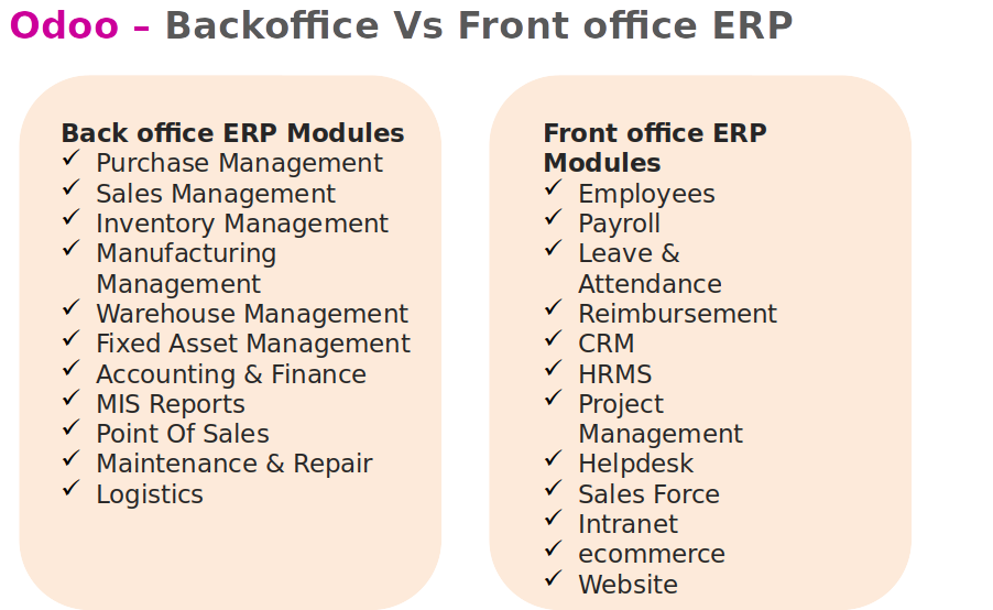 Odoo ERP is an open-source, all-in-one business management software that helps organizations streamline their operations. It provides a wide range of integrated modules such as Sales, CRM, Accounting, Inventory, HR, Manufacturing, Marketing, and eCommerce.