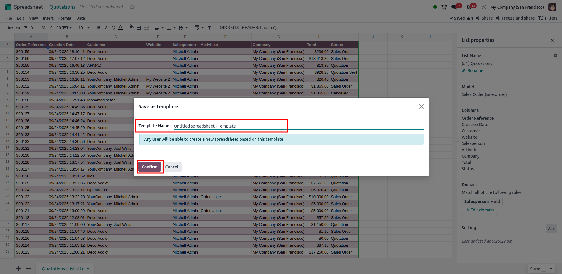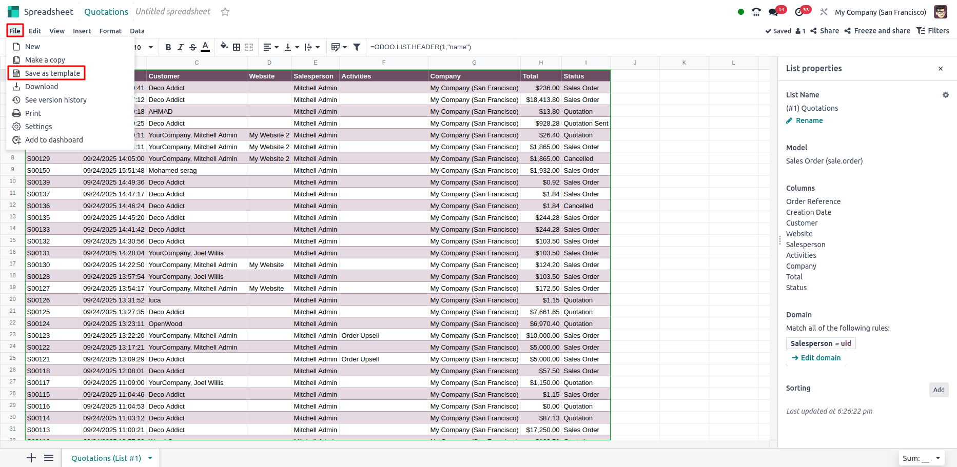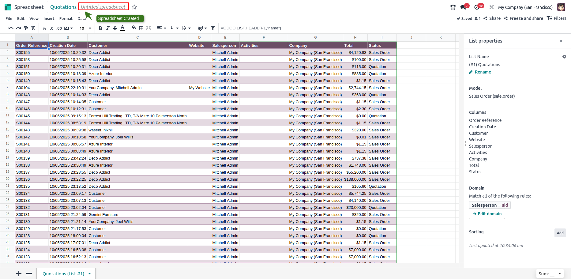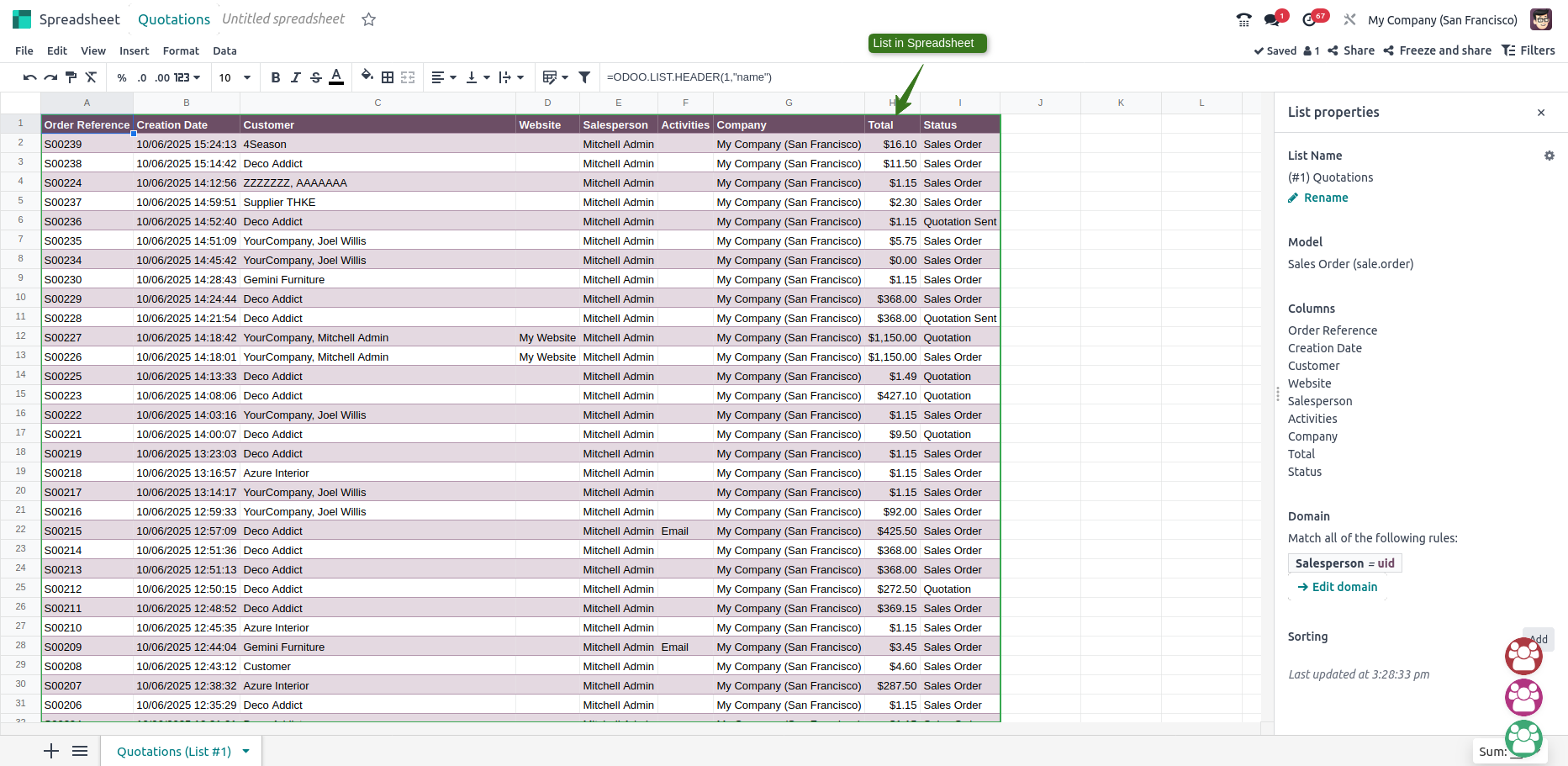 - The list remains connected to the Odoo database, meaning updates in Odoo are reflected in the spreadsheet