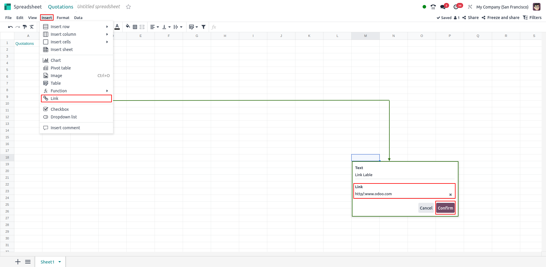 - Links can be inserted to Odoo menu items, other sheets in the same spreadsheet or external URLs