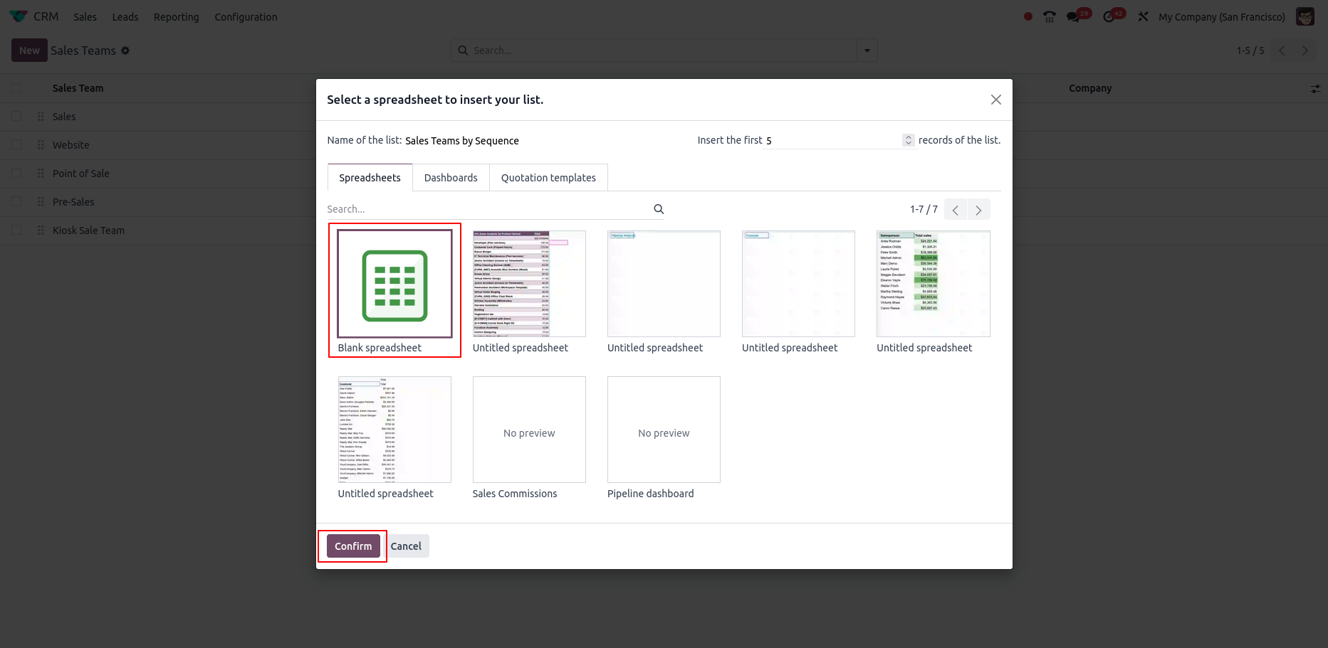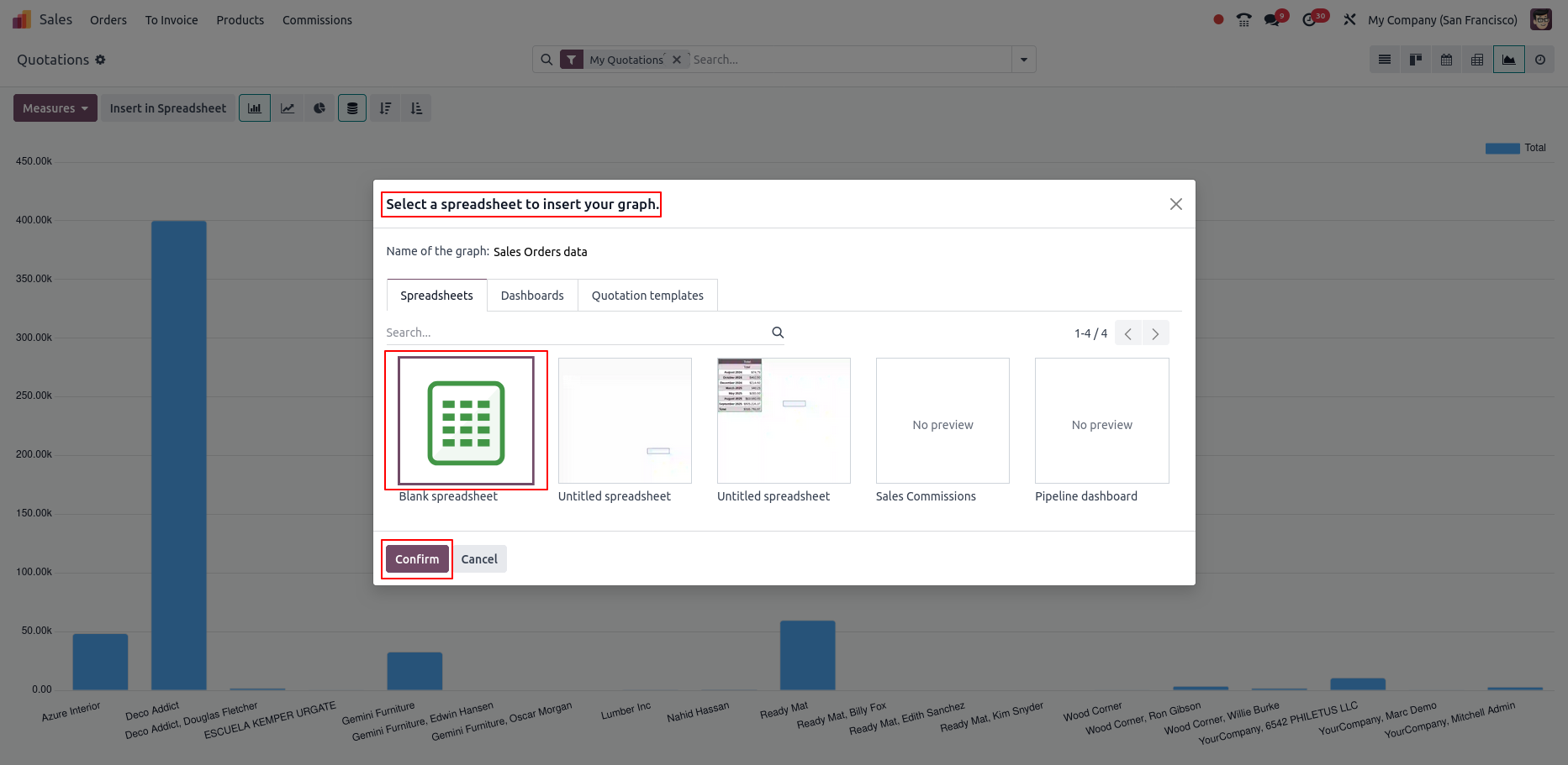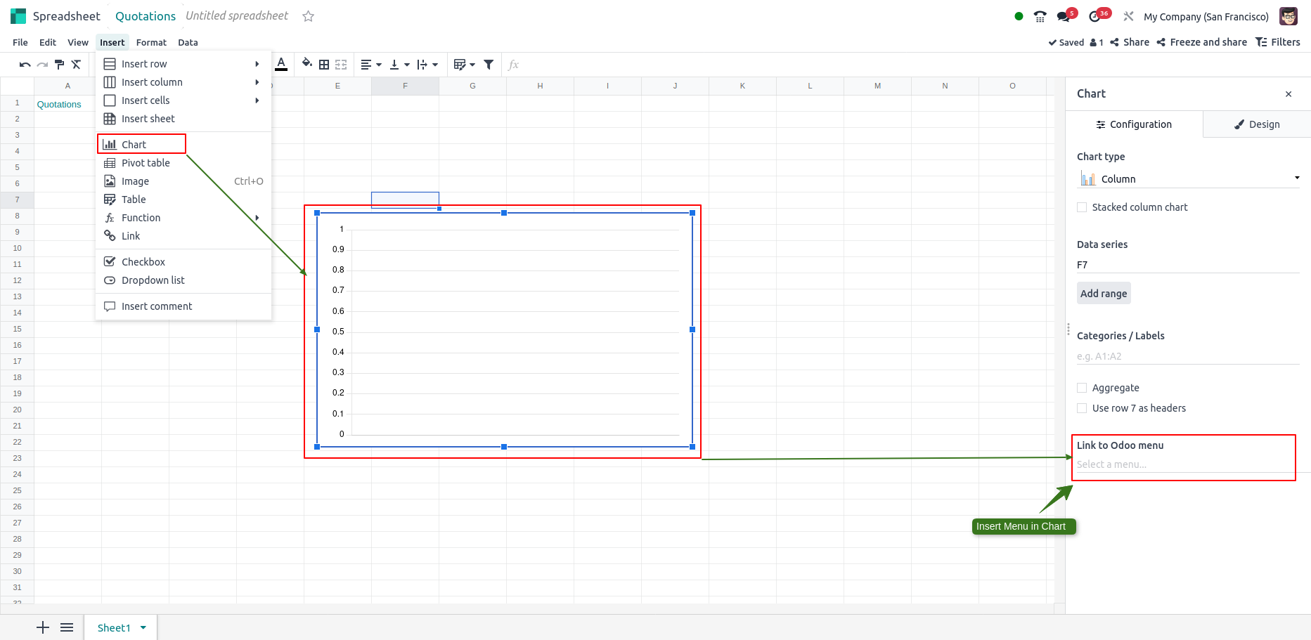 - Charts can be inserted directly from the Odoo database into a spreadsheet, with the option to create a new sheet or use an existing one