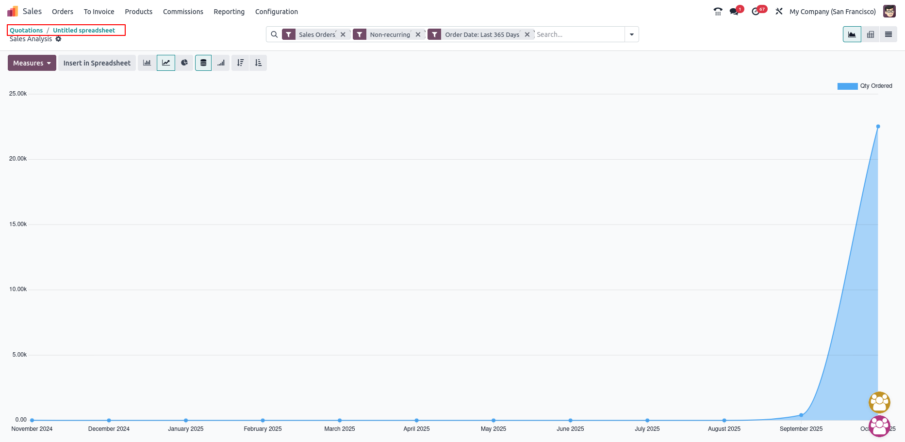 In Odoo, Spreadsheets act as an integrated reporting and analysis tool, combining the familiarity of traditional spreadsheets with the power of live Odoo data. Users can create, edit and collaborate on spreadsheets directly within the Odoo environment, eliminating the need to export data into external tools. With live links to Odoo models, spreadsheets update automatically, ensuring real-time accuracy for business decision-making.