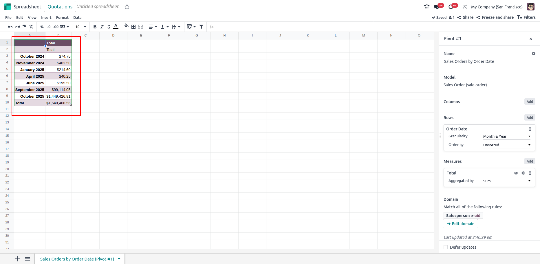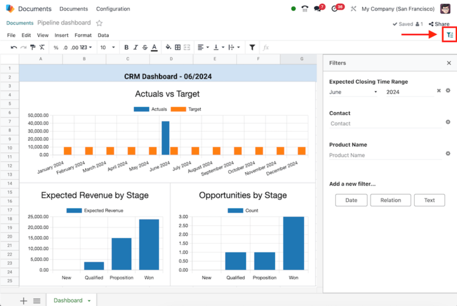 - Apply filters and groupings on data from Odoo within spreadsheets, mimicking report views