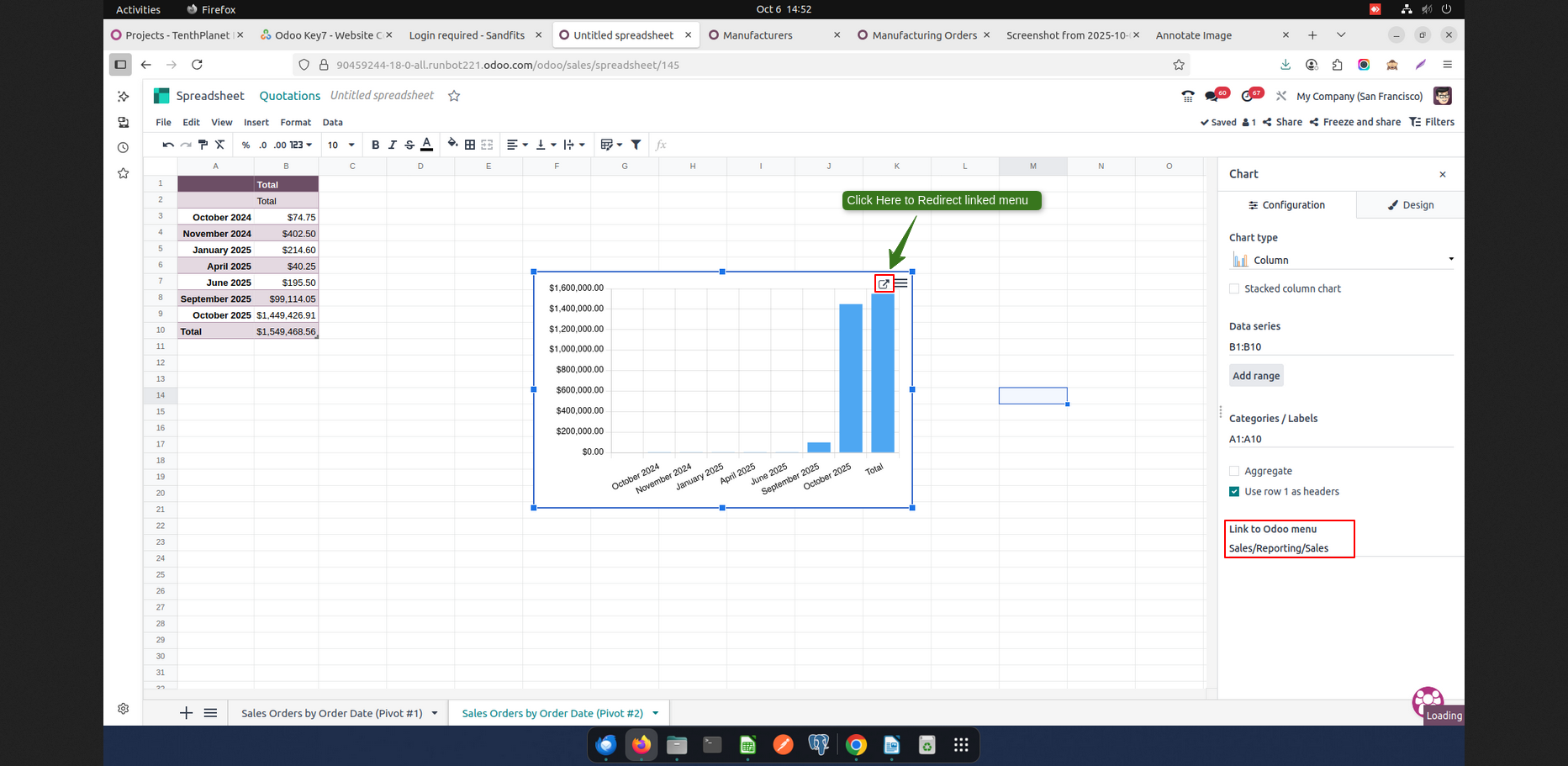 - Clicking a link to an Odoo menu item takes the user directly to the corresponding Odoo view, providing a seamless workflow between the spreadsheet and the Odoo interface
