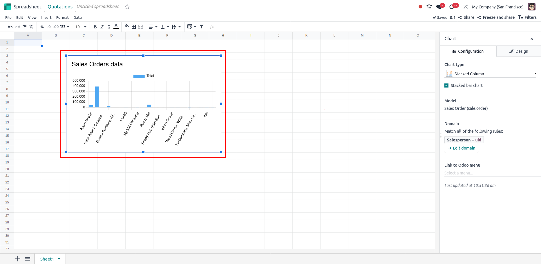 In Odoo , charts can be inserted into spreadsheets from the database with customizable names and interactive data points. Users can adjust chart types, design elements and apply domain filters for tailored data visualization. The charts can also include clickable links to Odoo menu items or other views for easy navigation.