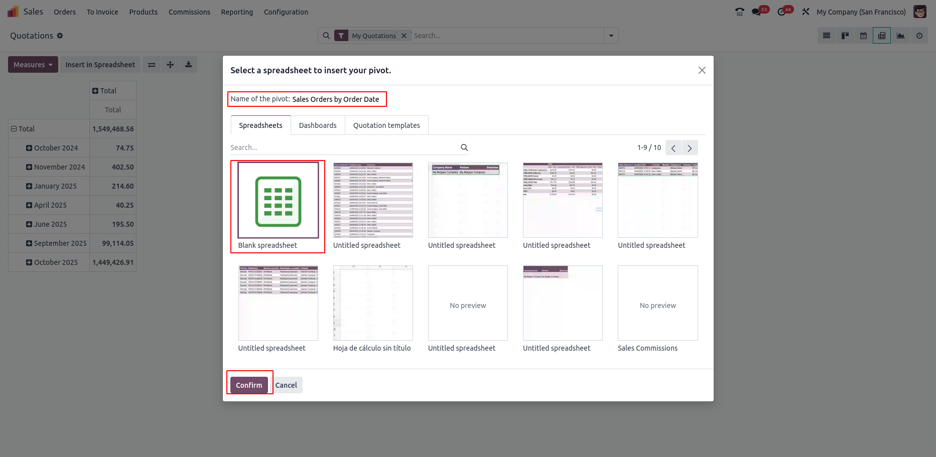 - Insert pivot tables into new or existing spreadsheets, automatically linking them to Odoo database data