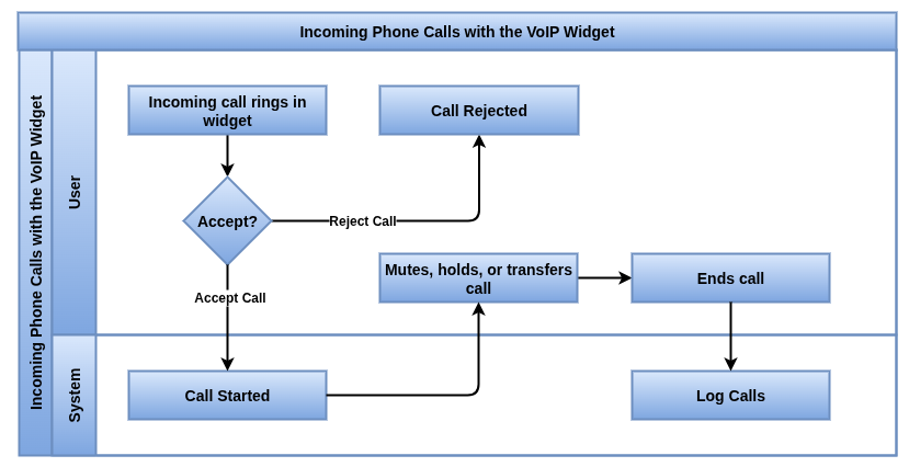 - Incoming calls are received via the VoIP widget with a ring and notification