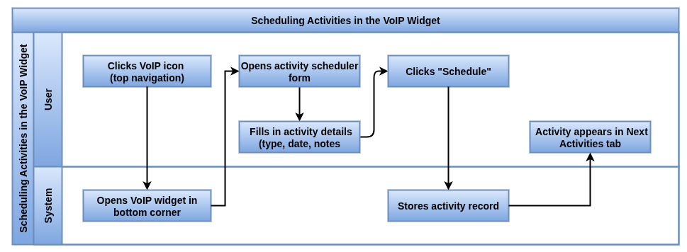 - Scheduled activities appear in the Next Activities tab of the VoIP widget for easy access and follow-up