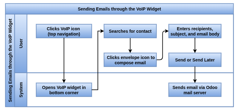 - Emails can be sent directly through the VoIP widget for quick communication with contacts