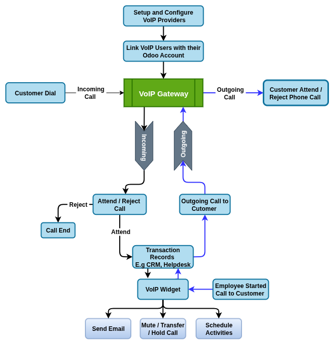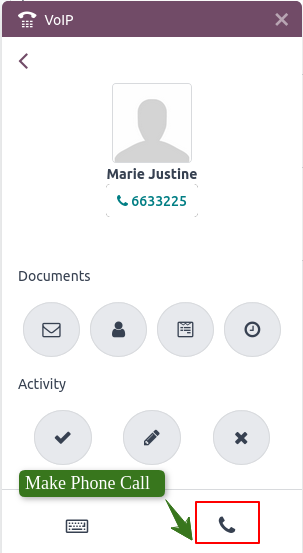 - Users can make and receive VoIP calls directly within Odoo, without the need for external applications