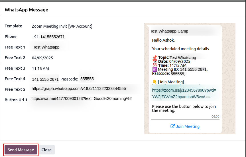 - Messages sent using templates must use valid API credentials (App ID, Phone Number ID, Access Token) configured in Odoo’s Whats App Business Account setup