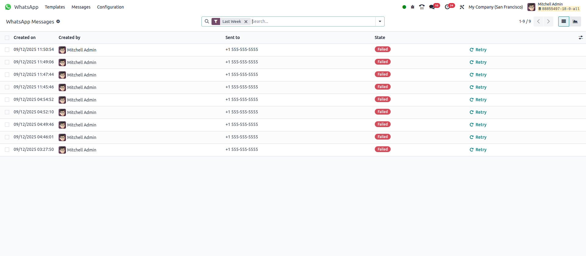 The WhatsApp Messages feature in Odoo Enterprise allows businesses to send, receive and track WhatsApp communications directly within Odoo. Messages are linked to business records (such as Sales, CRM, and Helpdesk), logged with status updates (Success, Fail, Retry) and managed through official WhatsApp Business API integration. This ensures real-time, traceable and automated customer communication without leaving the Odoo platform.