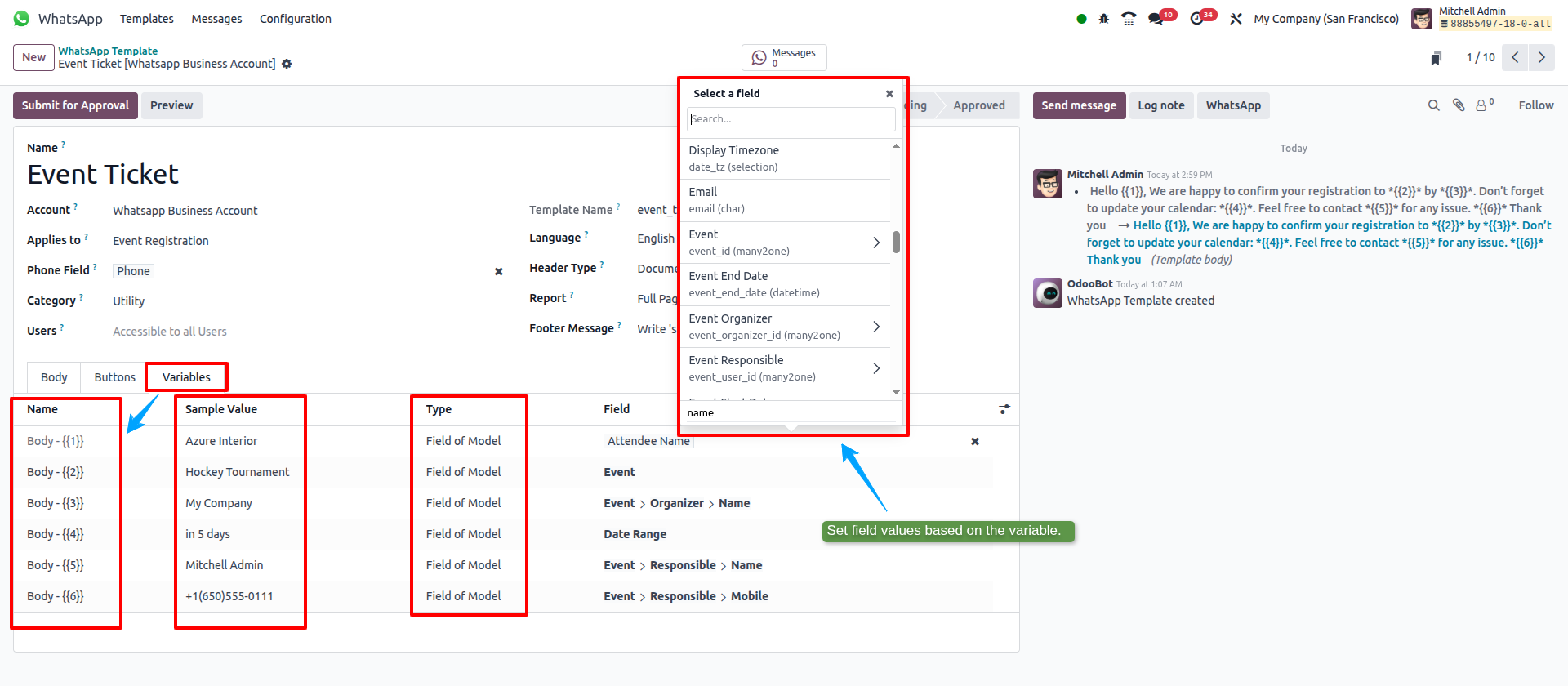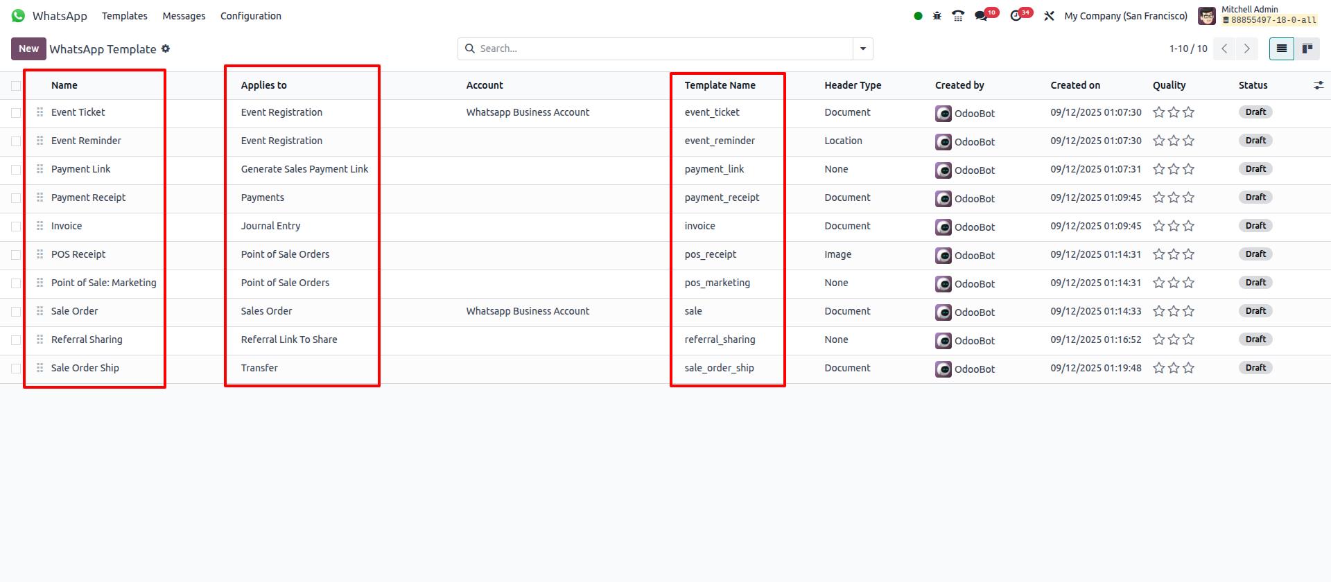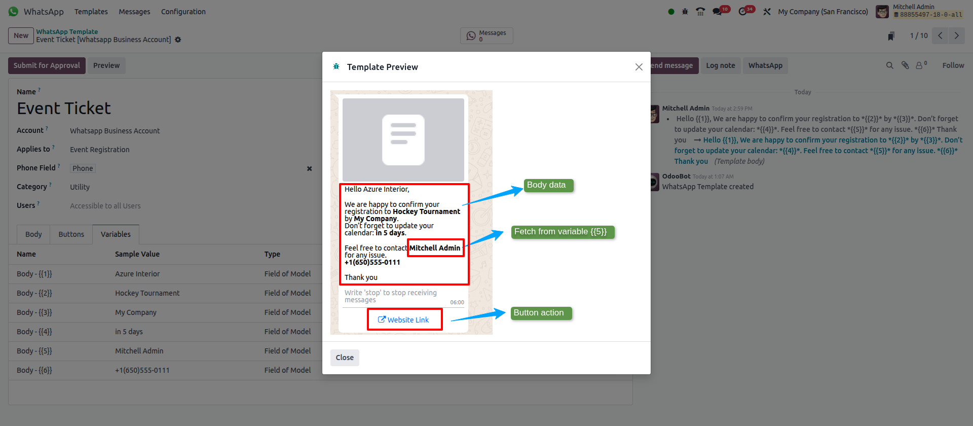 - Only authorized users can create, edit, submit for approval, synchronize or send Whats App templates within Odoo
