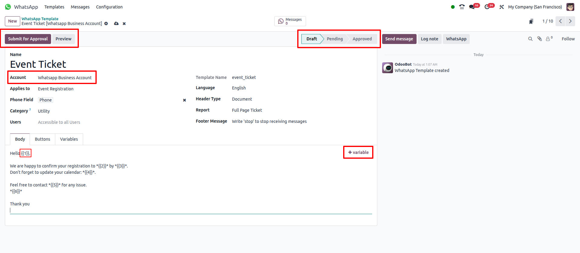 - Multiple language versions of the same template can be created; each version requires separate Whats App approval and Odoo synchronization