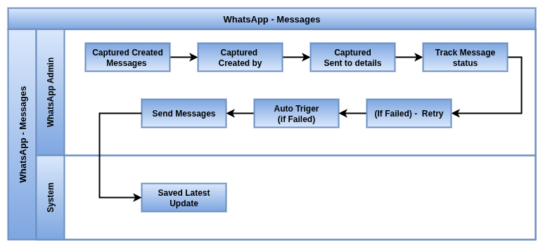 - Each Whats App message is recorded in the system with a timestamp, sender, recipient number and status